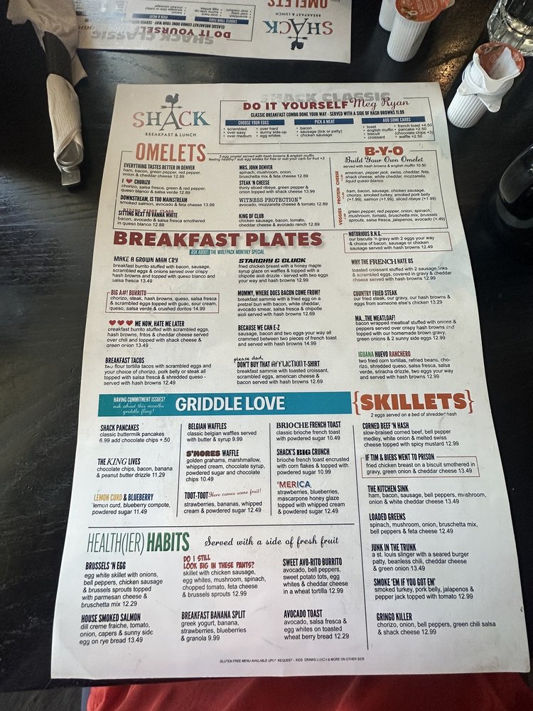 Shack Breakfast & Lunch, located in O'Fallon, MO, serves an expansive menu that guarantees satisfaction for every palate. Breakfast enthusiasts are in for a treat with unique offerings like the breakfast skillet featuring smoked turkey and pork belly, a highlight praised by patrons like Lamar Y. The menu goes beyond traditional fare, catering to various dietary needs with vegan options and gluten-free choices available.
